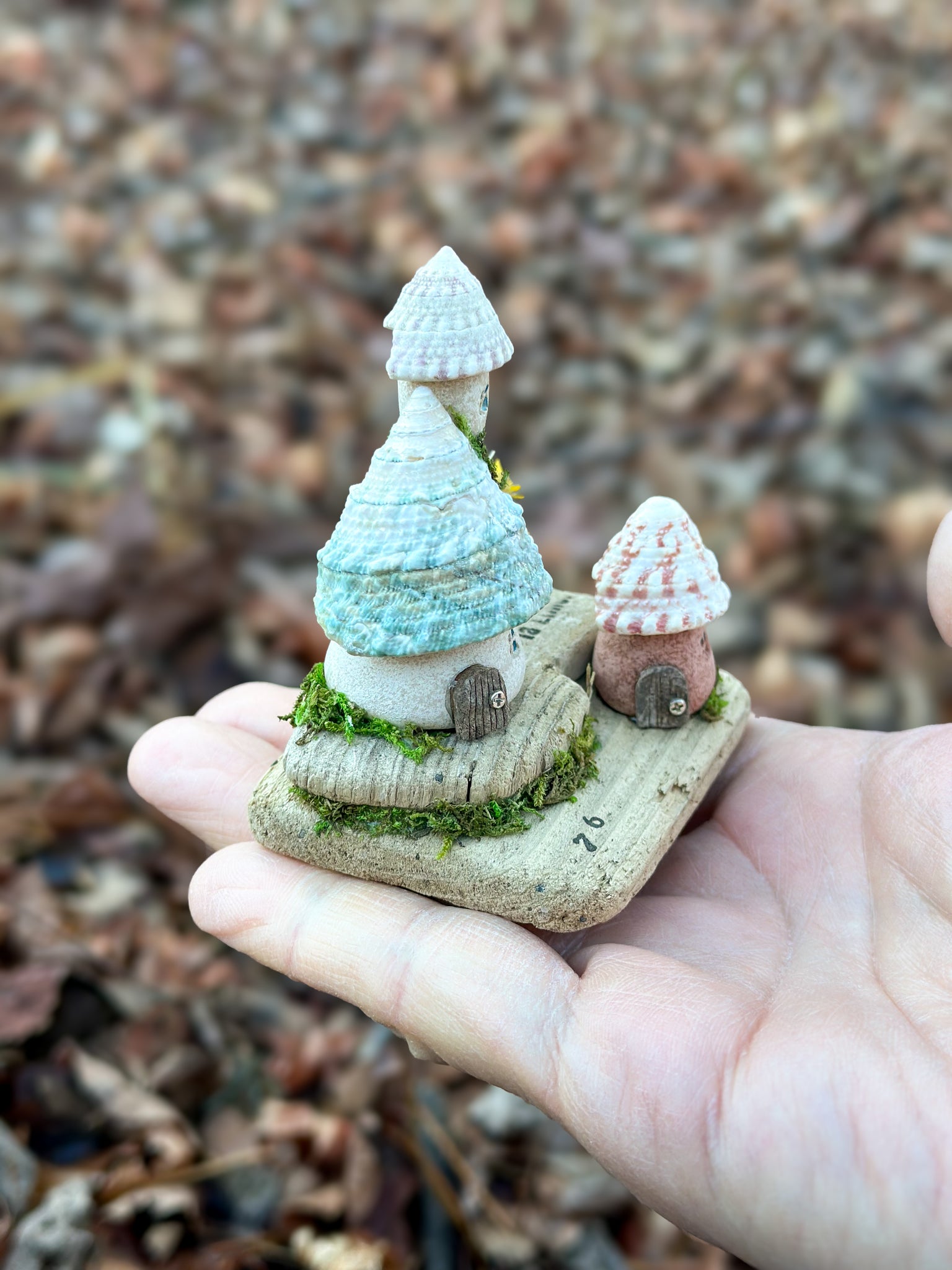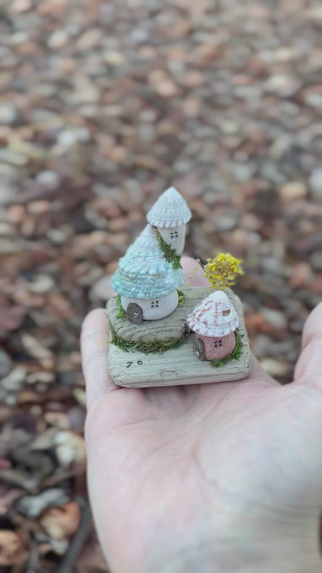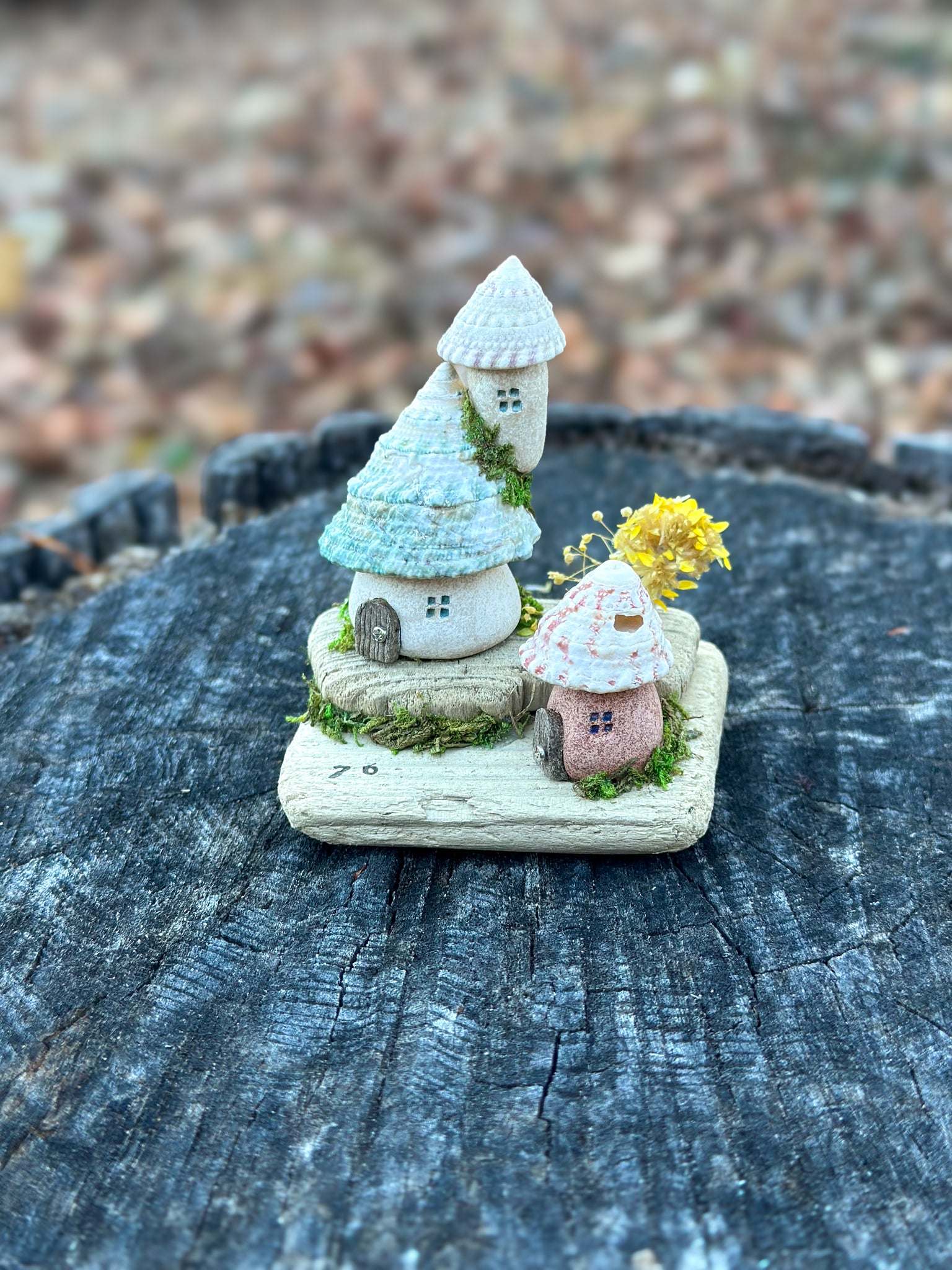 青い貝殻の美しい螺旋が空へと伸びる塔と、淡いピンクの花模様の屋根が可愛らしい小さな小屋。二つの家が自然の流木台座の上で静かに寄り添い、緑の苔と黄色い野花が彩りを添えます。「76」と刻まれた台座は、この小さな集落の住所のよう。