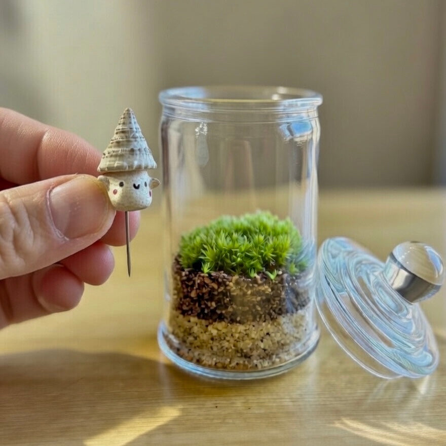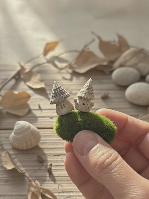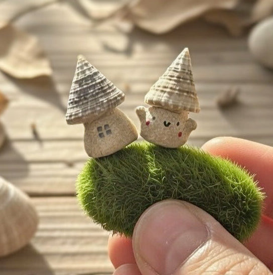 This miniature set features Chaplain, our most beloved character, and a seashell-roofed cottage — both shrunk to the size of a fingertip. Whether nestled in a glass jar, perched on a cushion of moss, or peeking through leaves, each placement tells a different story.