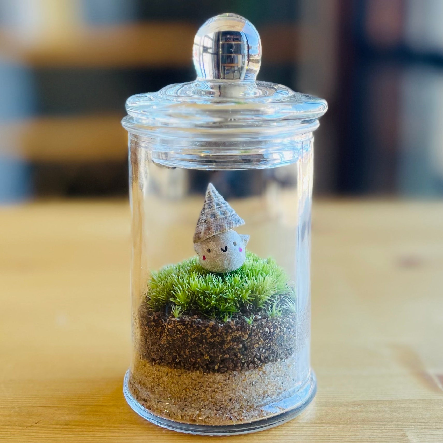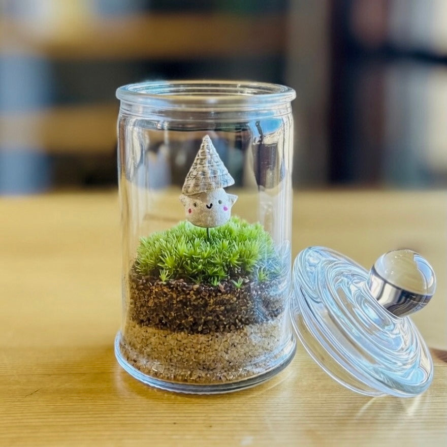 しおかぜレモンのまちで一番人気のキャラクター「チャップラン」と、貝殻屋根のお家。その愛らしい姿を、親指の先ほどの大きさに凝縮したミニチュアセットです。ガラスの瓶の中でも、苔の上でも、葉の隙間でも。置く場所が変わるたびに、違う物語が生まれます。